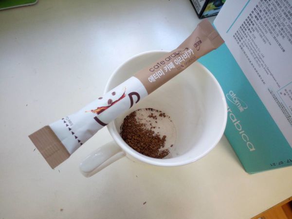 - 1..在杯中放入一包艾多美阿拉比卡三合一即溶咖啡